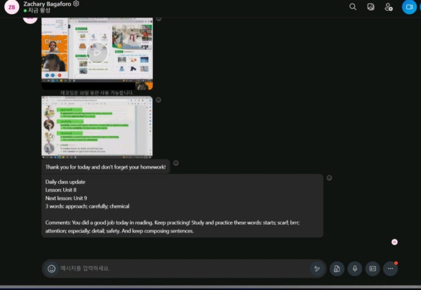 수업후 피드백 페이지 정보 작성자 최고관리자 댓글 0건 조회 46회 작성일 23-05-24 19:42 본문 클레버톡은 수업후 선생님께서 수업녹화분과 그날배운내용및 수업에 관한 멘트 그리고 매일 숙제로 나가는 단어를 학생과 공부하는 skype 메세지창에 업데이트해드립니다. 목록 다음글낮시간(11am~6pm) 10%할인 23.05.17 댓글목록 댓글목록 등록된 댓글이 없습니다.